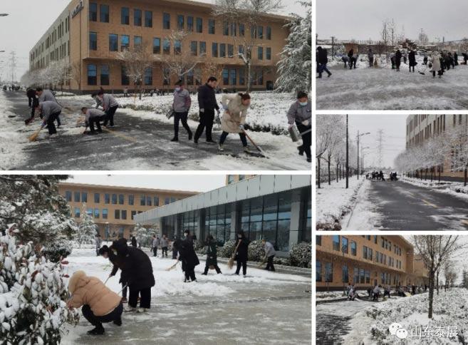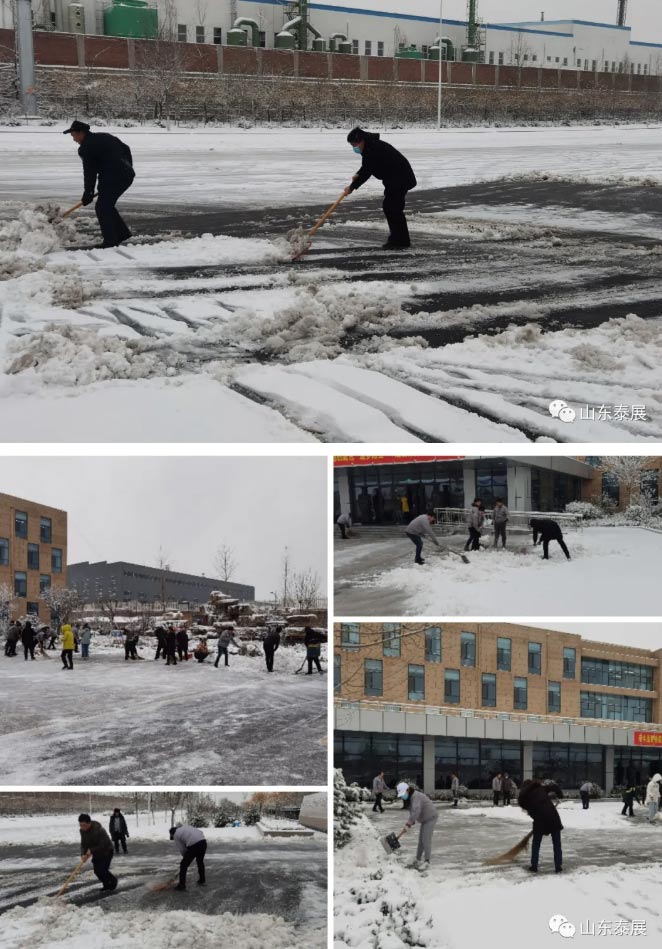 厚厚的積雪給大家的出行帶來了諸多不便,為暢(chàng)通交通(tōng)、方便通行。29日上午,在劉總的帶領下,公司全體職工上班後第一時間開展了義務掃雪(xuě)活動。大家不畏嚴寒,揮舞著鐵鍁(xiān)、掃把等(děng)開始對公司(sī)辦公樓、廠房附近及(jí)路上的積雪和結冰進行清掃。大家你追我趕,齊心協力,配合默契,幹得熱火朝天,不亦樂乎(hū);忙碌的身影(yǐng)構成了泰展一道美麗的風景(jǐng)線。